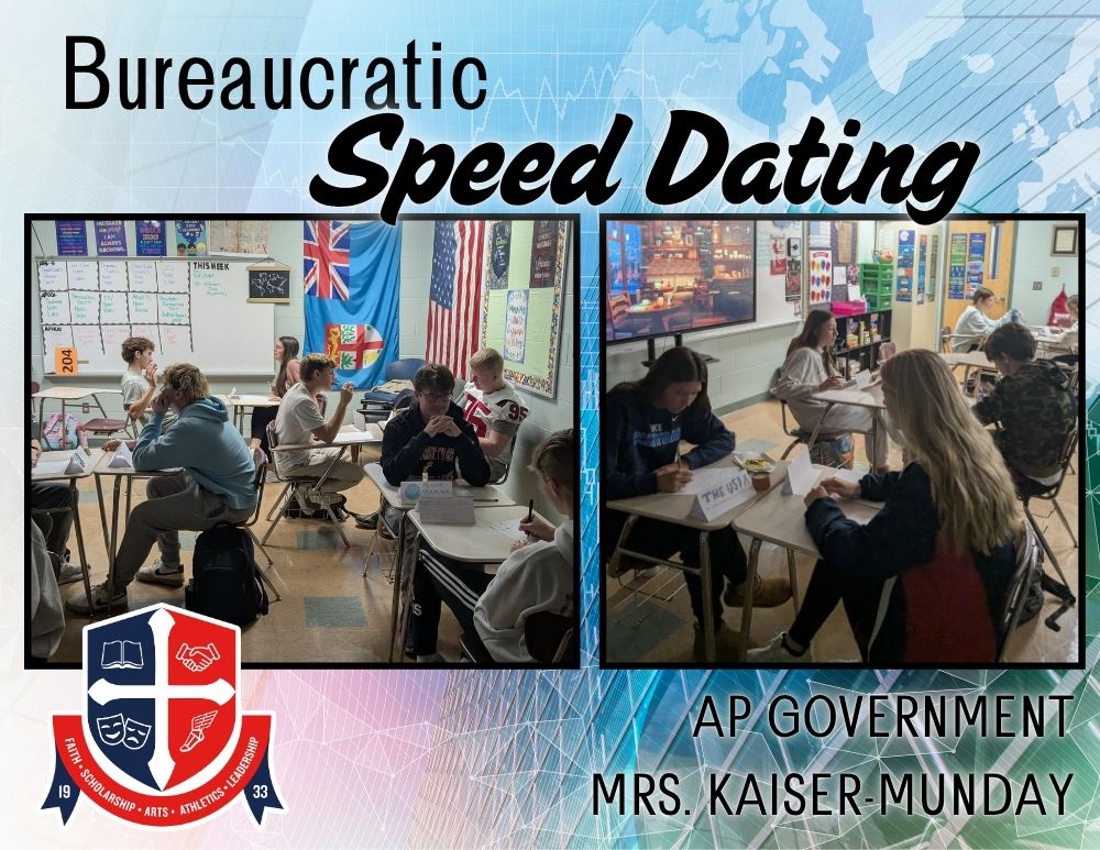 The AP Government students are studying the US government's bureaucracy and each chose a bureaucratic agency. They had to create a "profile" and be able to explain their bureaucracy, and then speed-dated with others to see which agencies worked best with each other.