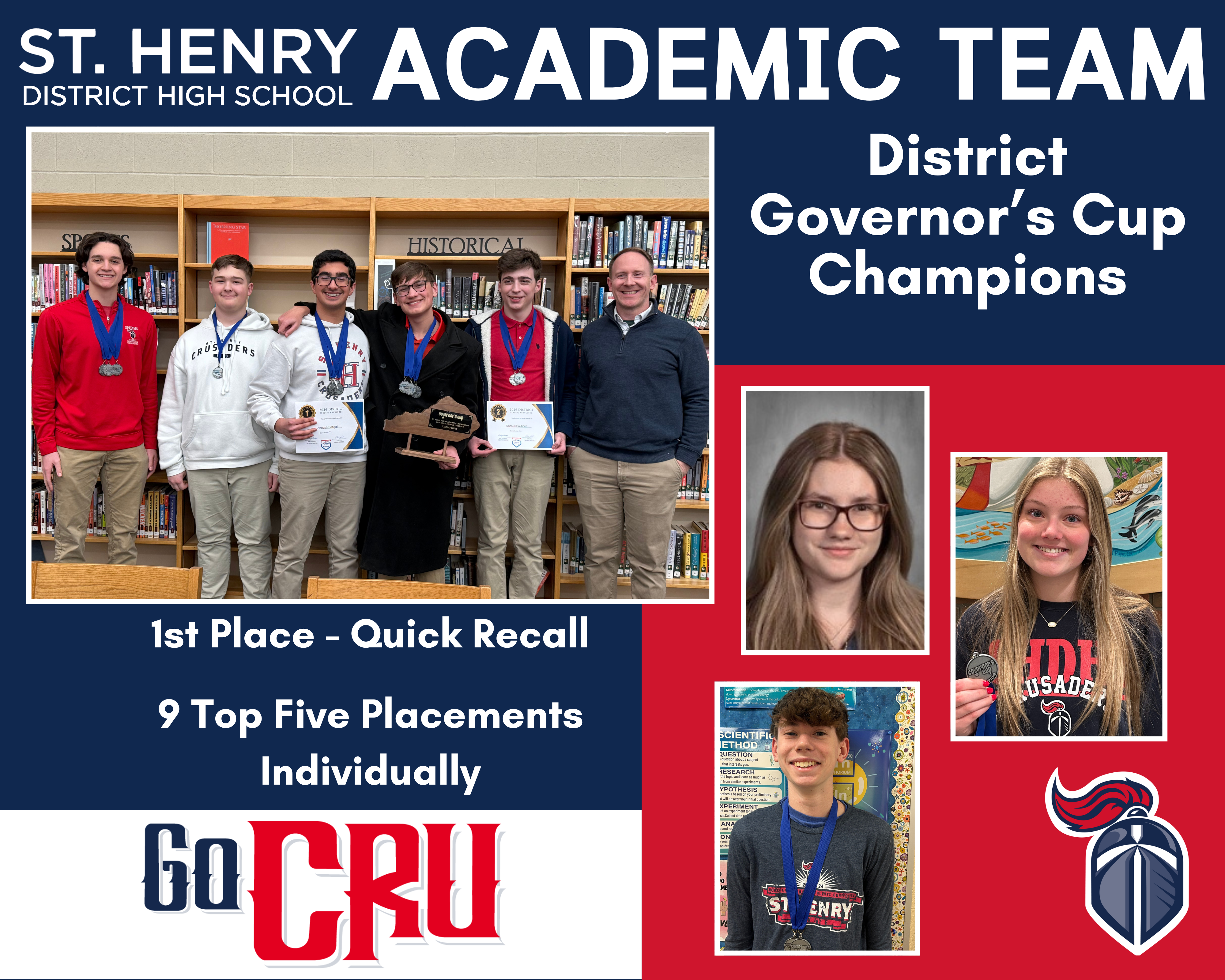In individual competition, the CRU brought home 9 Top Five placements: Samuel Haubner, 1st Place in Science; Luke Jankowski, 1st Place in Social Studies and 3rd Place in Arts & Humanities; Ethan Lubbers, 5th Place in Language Arts; Brynlee Rice, 4th Place in Composition; Aneesh Sehgal, 2nd Place in Math and 4th Place in Social Studies; and Noah Von Handorf, 3rd Place in Social Studies and 4th Place in Science. Finally, on the General Knowledge test, Aneesh earned 1st Place, and Samuel tied for 3rd Place.
