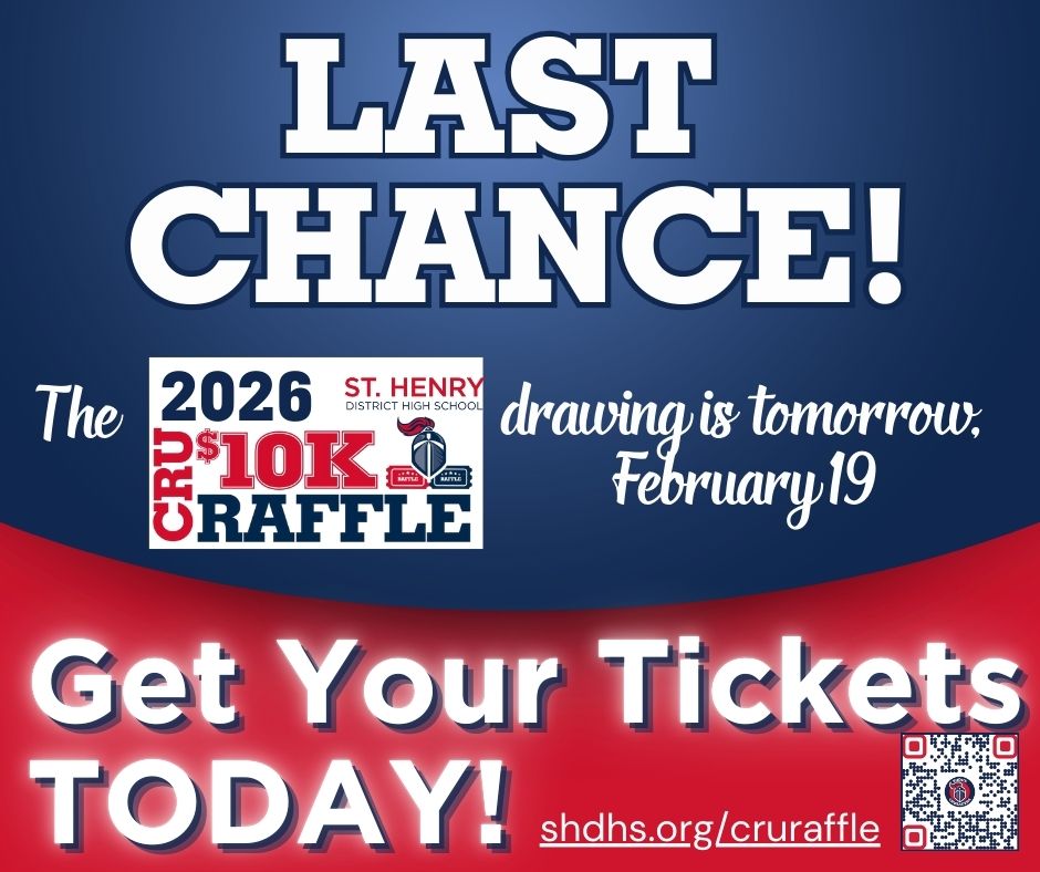 Dear Parents, Alumni, and Friends of SHDHS, Last chance! Time is running out to get your tickets for the CRU $10K Raffle, and we don’t want you to miss your chance to win—and support our students at the same time. With three chances to win, you could walk away with: Every ticket purchased directly benefits St. Henry District High School and helps us continue providing exceptional opportunities for our students. Don’t wait, get your tickets today before the raffle closes: Thank you for your continued support and for being such an important part of the SHDHS community. Advancement/ Enrollment Department